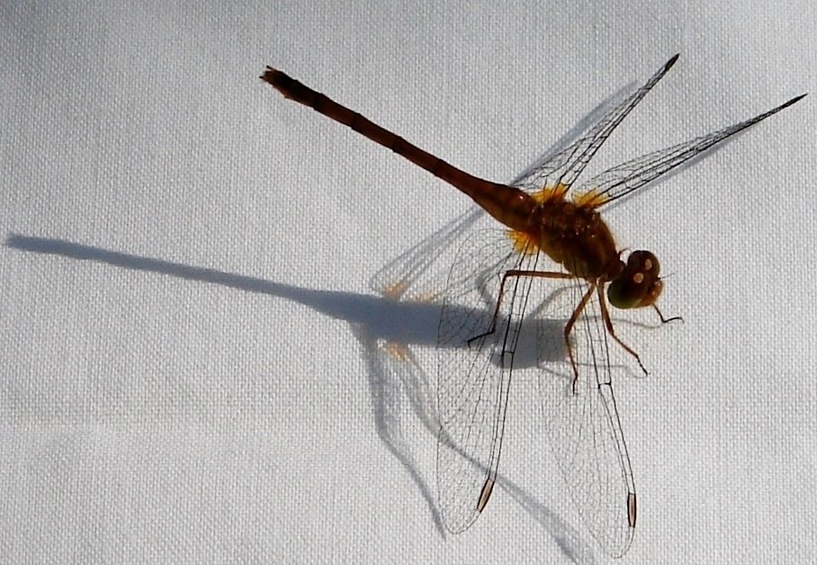 All spring and summer I headed out with my Sony camera, hoping to capture my favorite insect-the dragonfly. But their capricious antics and sudden darts and dives and refusal to land anywhere for more than a second, left me without a picture. Then this last Saturday, as I was outside mounting some pictures for our County Fair, one landed on the table. I drew in a shocked breath and told it to wait while I dashed inside for my camera. First I had to find it, then, the memory stick was in my purse from trips to the photo center, so I had to get it out and insert it before I could use it. As I hurried back outside, I had a sinking feeling it wouldn’t be there, but it was. It hadn’t moved. It stayed in that position while I shoot it from every angle I could. I was beginning to worry that it had landed in some of the glue over-spray and was stuck, but after eight pictures, it took off and flew away.