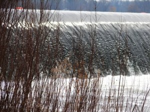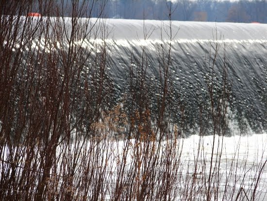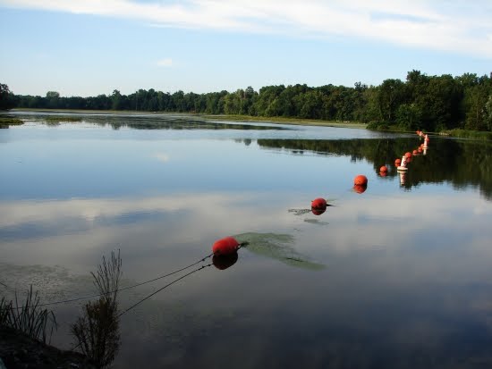 A beautiful placid pond . . . serene, still, quiet. On the other side is the dam and spillway. The rope and floats stretch across one end as a warning, hopefully to prevent someone from going over the dam, which would be a most unpleasant and potentially dangerous ride.