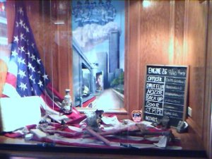 Each Year I remember this heroic man who captured my admiration and respect. His wife, Mary, and I are now friends. She posted this picture and said the following: “this painting (in the middle of the glass case memorial) is of an actual photograph found inside the truck of Engine 26. It was taken on the way to the World Trade Center. It is amazing, when the other firefighters found the camera in the truck, they never thought they would find such photos. After developing, they held that one for awhile before letting me know about it. Apparently one of the firefighters sitting in the back leaned out as they were approaching the towers and took the shot–Tom’s reflection happen to be in the mirror.”