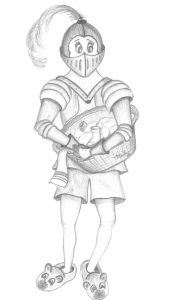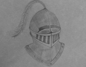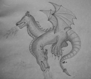 Helmet and 2 Headed Dragon: pencil illustrations for my children’s book: The Bumbling Sir Hector